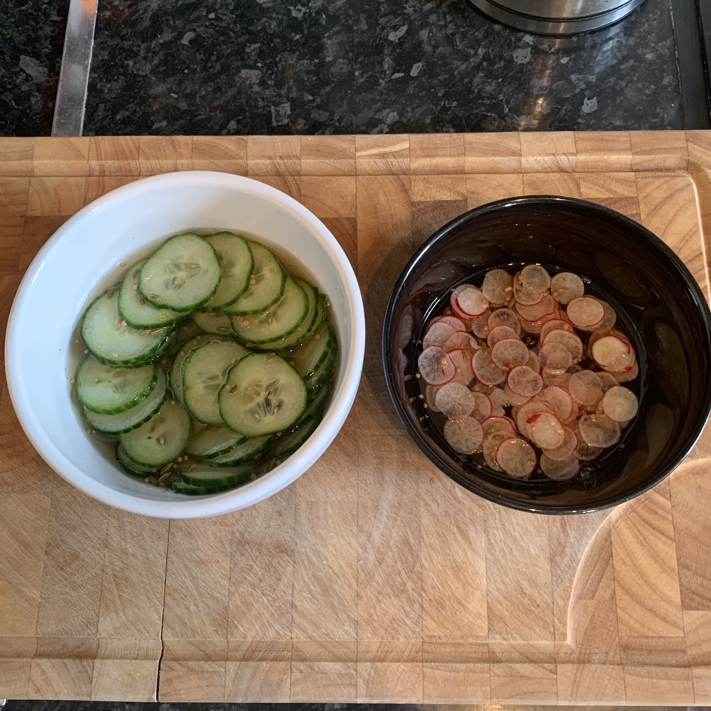 Grilled mackerel with wasabi potato mash, cooked beetroot and pickled cucumber and radish