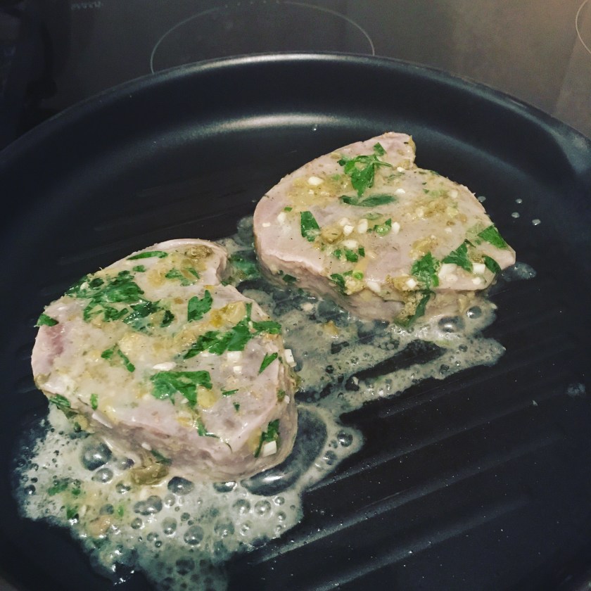 Marinated pan fried tuna steak with salsa verde