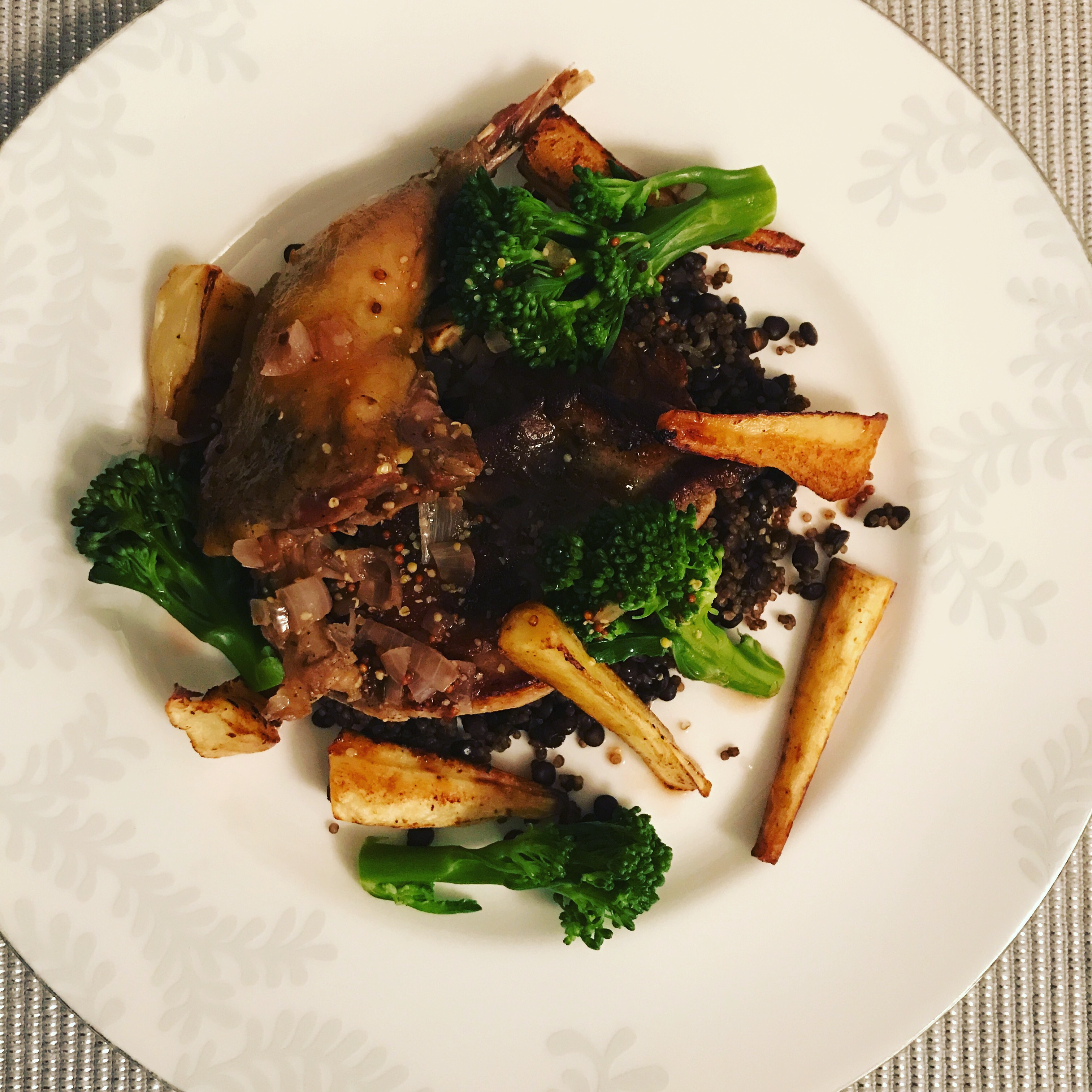 Pan seared, oven roasted duck breast with garlic potato mash and roasted beetroot