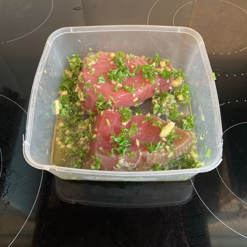 Marinated pan fried tuna steak with salsa verde