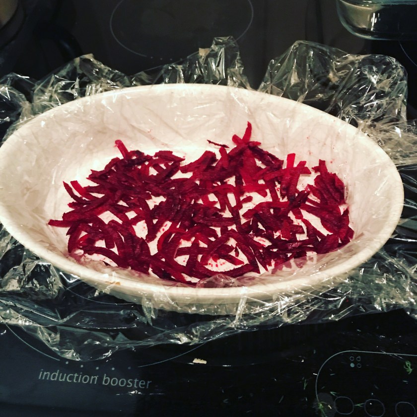 Grilled mackerel with wasabi potato mash, cooked beetroot and pickled cucumber and radish