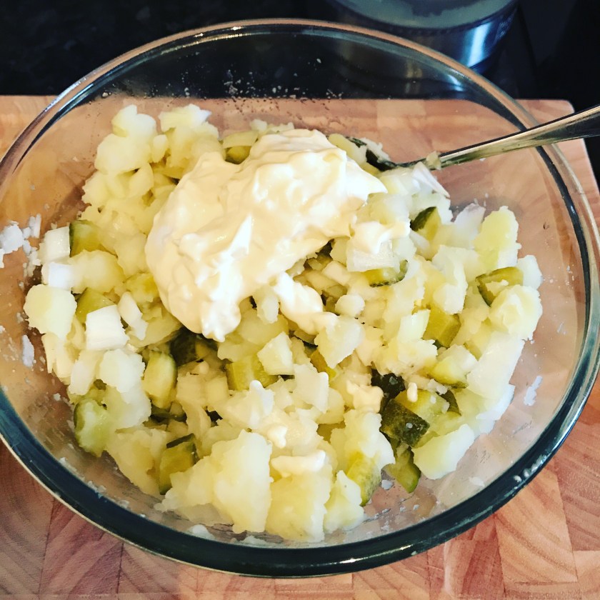 Grilled mackerel with wasabi potato mash, cooked beetroot and pickled cucumber and radish