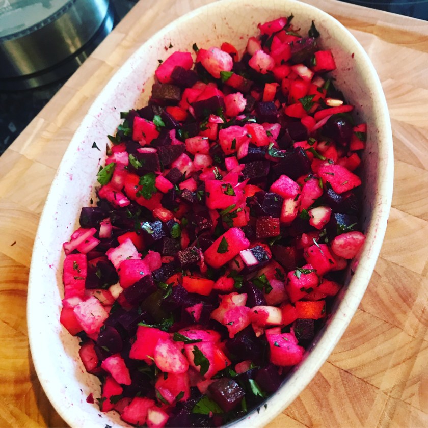 Grilled mackerel with wasabi potato mash, cooked beetroot and pickled cucumber and radish