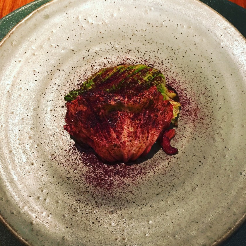 Grilled mackerel with wasabi potato mash, cooked beetroot and pickled cucumber and radish
