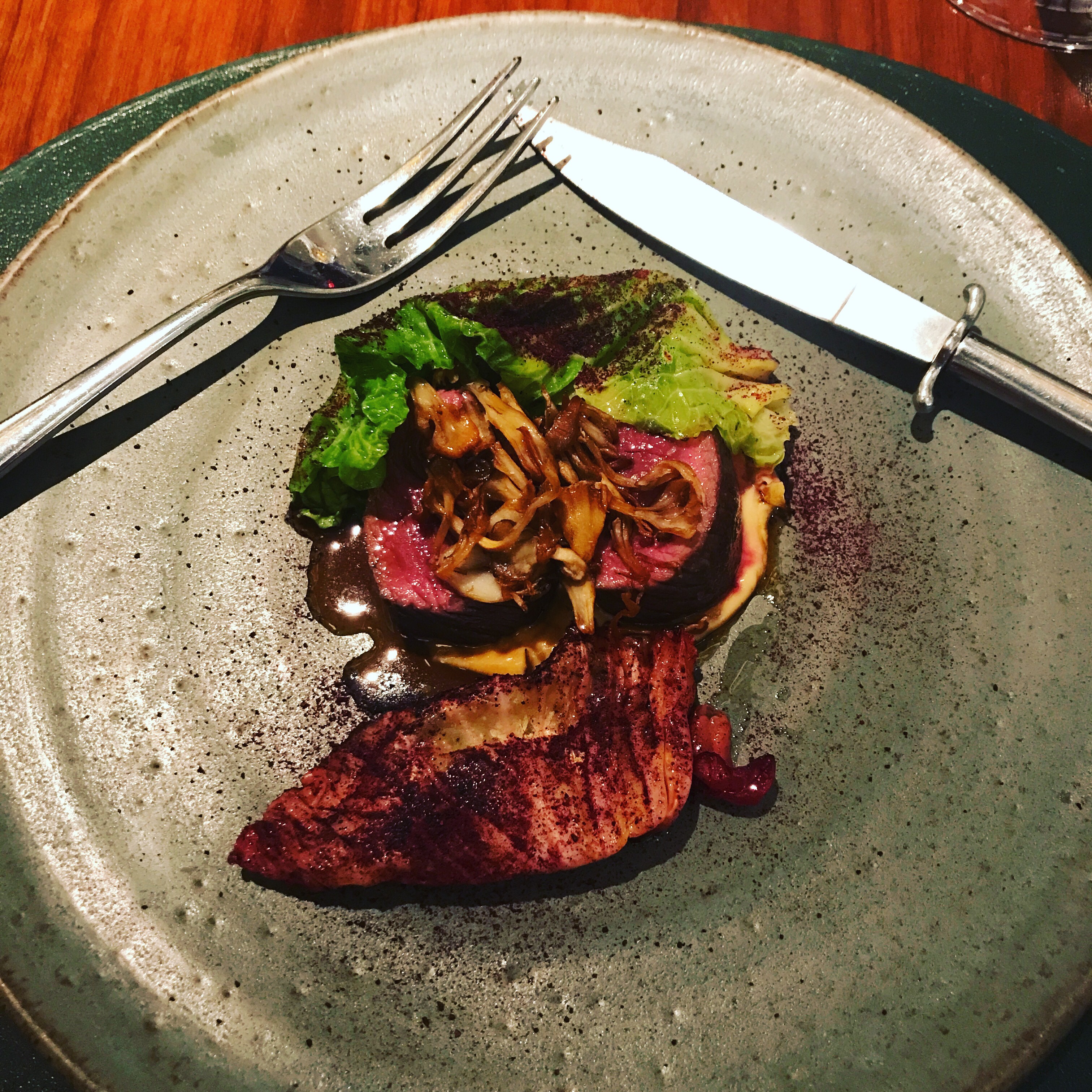 Pan seared, oven roasted duck breast with garlic potato mash and roasted beetroot