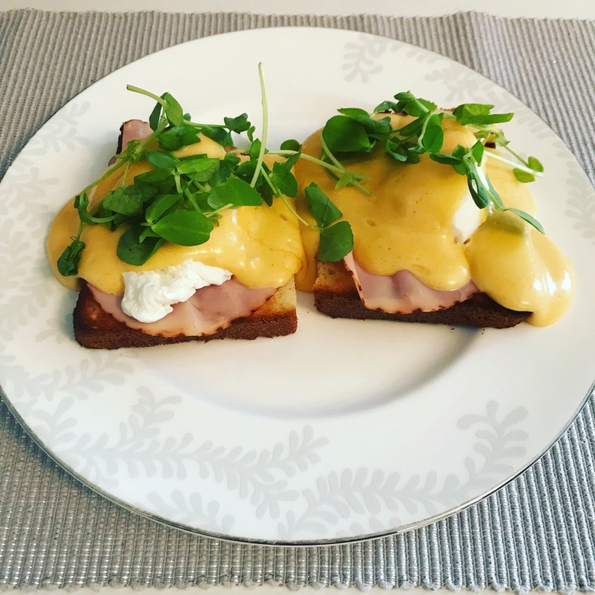 Poached eggs and asparagus wrapped in bacon with Béarnaise sauce