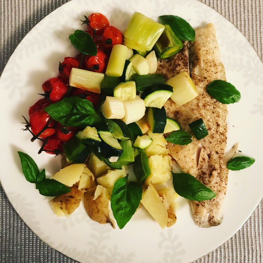 Grilled mackerel with wasabi potato mash, cooked beetroot and pickled cucumber and radish