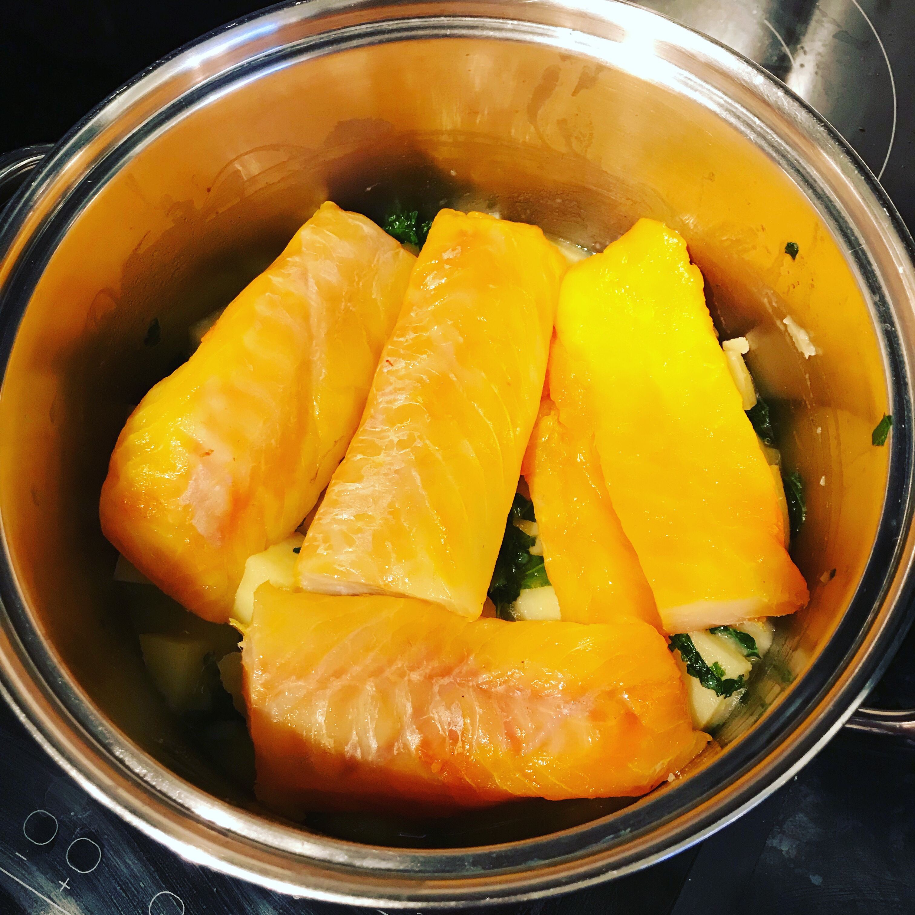 Grilled mackerel with wasabi potato mash, cooked beetroot and pickled cucumber and radish