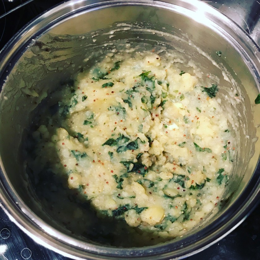 Grilled mackerel with wasabi potato mash, cooked beetroot and pickled cucumber and radish