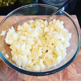 1. Boil the potatoes with skin on, until just about cooked, but do take care you don’t overlook them. While the potatoes are boiling, peel and chop the onions. Cut the ends off the gherkins, then cut in quarters lengthwise, then chop to cubes.
